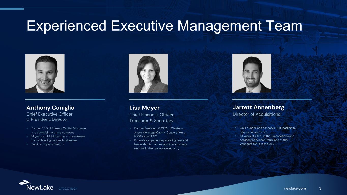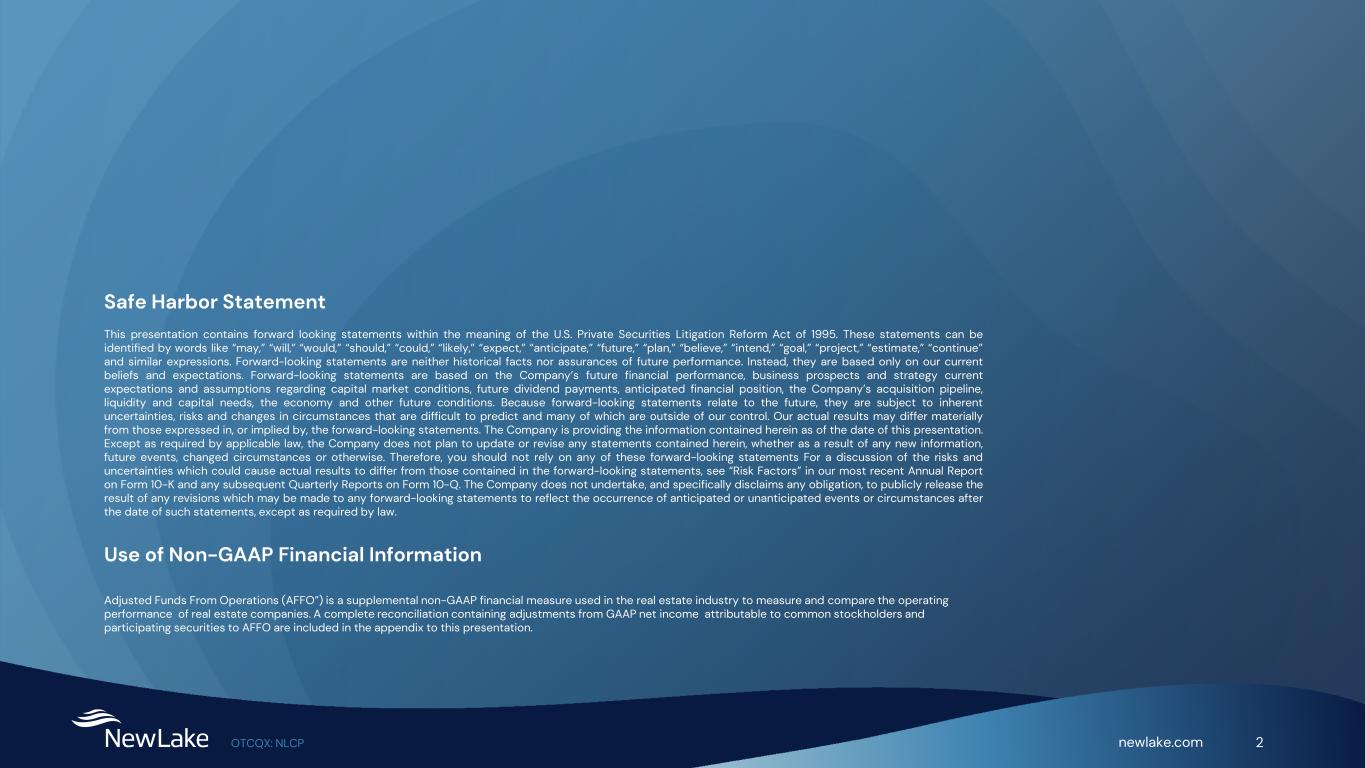 This presentation contains forward looking statements within the meaning of the U.S. Private Securities Litigation Reform Act of 1995. These statements can be identified by words like “may,” “will,” “would,” “should,” “could,” “likely,” “expect,” “anticipate,” “future,” “plan,” “believe,” “intend,” “goal,” “project,” “estimate,” “continue” and similar expressions. Forward-looking statements are neither historical facts nor assurances of future performance. Instead, they are based only on our current beliefs and expectations. Forward-looking statements are based on the Company’s future financial performance, business prospects and strategy current expectations and assumptions regarding capital market conditions, future dividend payments, anticipated financial position, the Company’s acquisition pipeline, liquidity and capital needs, the economy and other future conditions. Because forward-looking statements relate to the future, they are subject to inherent uncertainties, risks and changes in circumstances that are difficult to predict and many of which are outside of our control. Our actual results may differ materially from those expressed in, or implied by, the forward-looking statements. The Company is providing the information contained herein as of the date of this presentation. Except as required by applicable law, the Company does not plan to update or revise any statements contained herein, whether as a result of any new information, future events, changed circumstances or otherwise. Therefore, you should not rely on any of these forward-looking statements For a discussion of the risks and uncertainties which could cause actual results to differ from those contained in the forward-looking statements, see “Risk Factors” in our most recent Annual Report on Form 10-K and any subsequent Quarterly Reports on Form 10-Q. The Company does not undertake, and specifically disclaims any obligation, to publicly release the result of any revisions which may be made to any forward-looking statements to reflect the occurrence of anticipated or unanticipated events or circumstances after the date of such statements, except as required by law. Safe Harbor Statement newlake.com 2OTCQX: NLCP Use of Non-GAAP Financial Information Adjusted Funds From Operations (AFFO”) is a supplemental non-GAAP financial measure used in the real estate industry to measure and compare the operating performance of real estate companies. A complete reconciliation containing adjustments from GAAP net income attributable to common stockholders and participating securities to AFFO are included in the appendix to this presentation.