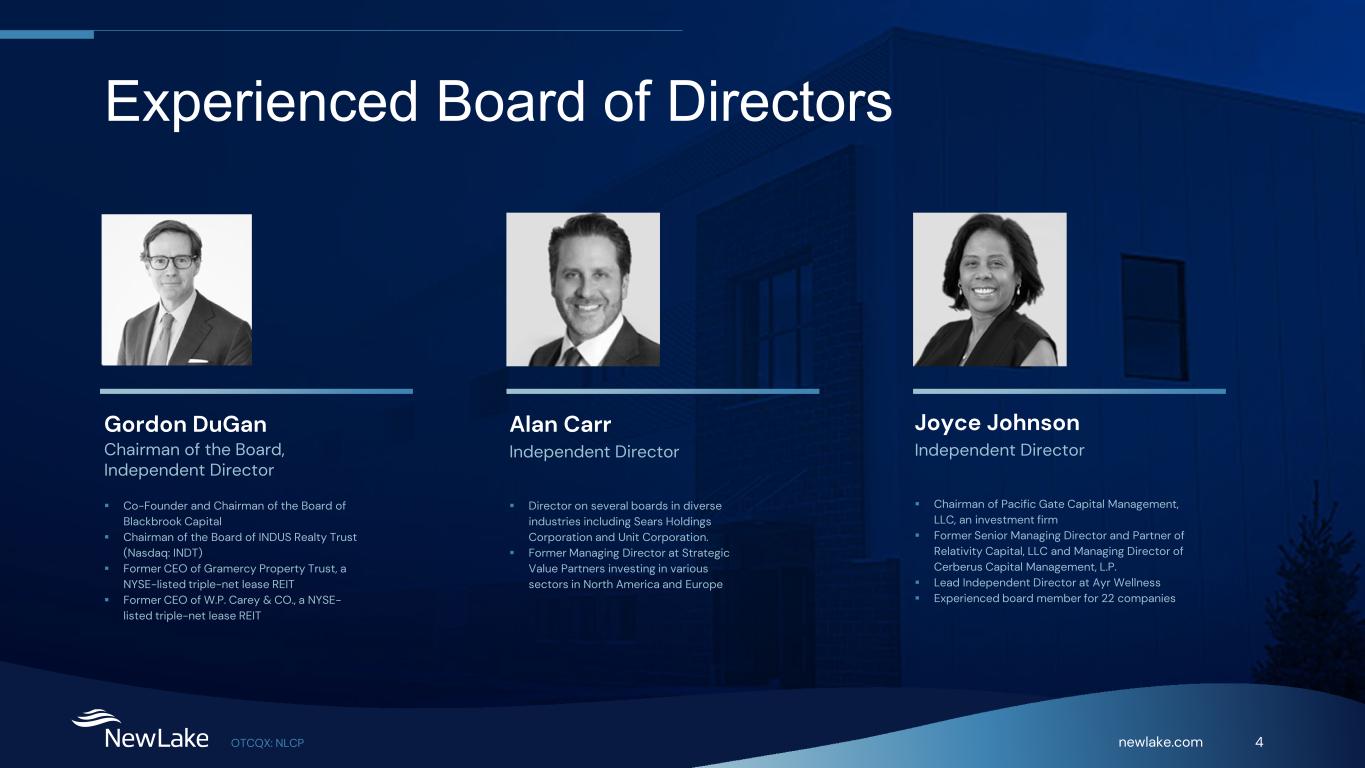newlake.com 3OTCQX: NLCP Experienced Executive Management Team Anthony Coniglio Chief Executive Officer & President, Director Lisa Meyer Chief Financial Officer, Treasurer & Secretary Jarrett Annenberg Director of Acquisitions Former CEO of Primary Capital Mortgage, a residential mortgage company 14 years at J.P. Morgan as an investment banker leading various businesses Public company director Former President & CFO of Western Asset Mortgage Capital Corporation, a NYSE-listed REIT Extensive experience providing financial leadership to various public and private entities in the real estate industry Co-Founder of a cannabis REIT leading its acquisition activities 10 years at CBRE in the Transactions and Advisory Services Group, one of the youngest SVPs in the U.S.
