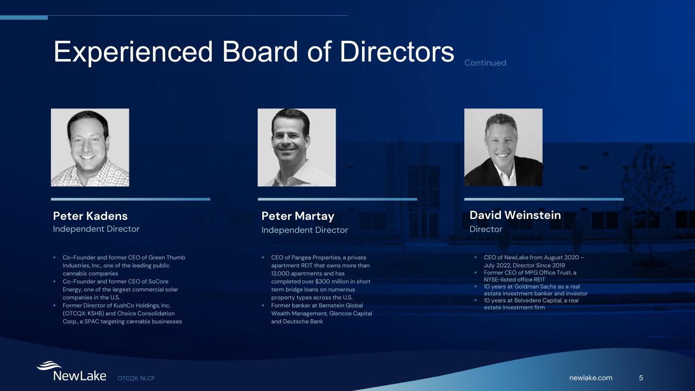 newlake.com 4OTCQX: NLCP Experienced Board of Directors Gordon DuGan Chairman of the Board, Independent Director Alan Carr Independent Director Joyce Johnson Independent Director Co-Founder and Chairman of the Board of Blackbrook Capital Chairman of the Board of INDUS Realty Trust (Nasdaq: INDT) Former CEO of Gramercy Property Trust, a NYSE-listed triple-net lease REIT Former CEO of W.P. Carey & CO., a NYSE- listed triple-net lease REIT Director on several boards in diverse industries including Sears Holdings Corporation and Unit Corporation. Former Managing Director at Strategic Value Partners investing in various sectors in North America and Europe Chairman of Pacific Gate Capital Management, LLC, an investment firm Former Senior Managing Director and Partner of Relativity Capital, LLC and Managing Director of Cerberus Capital Management, L.P. Lead Independent Director at Ayr Wellness Experienced board member for 22 companies