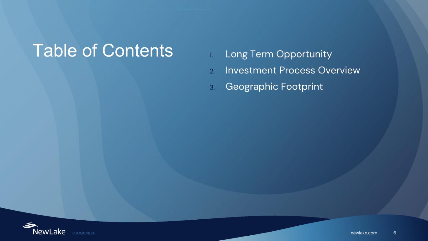 newlake.com 6OTCQX: NLCP 1. Long Term Opportunity 2. Investment Process Overview 3. Geographic Footprint Table of Contents