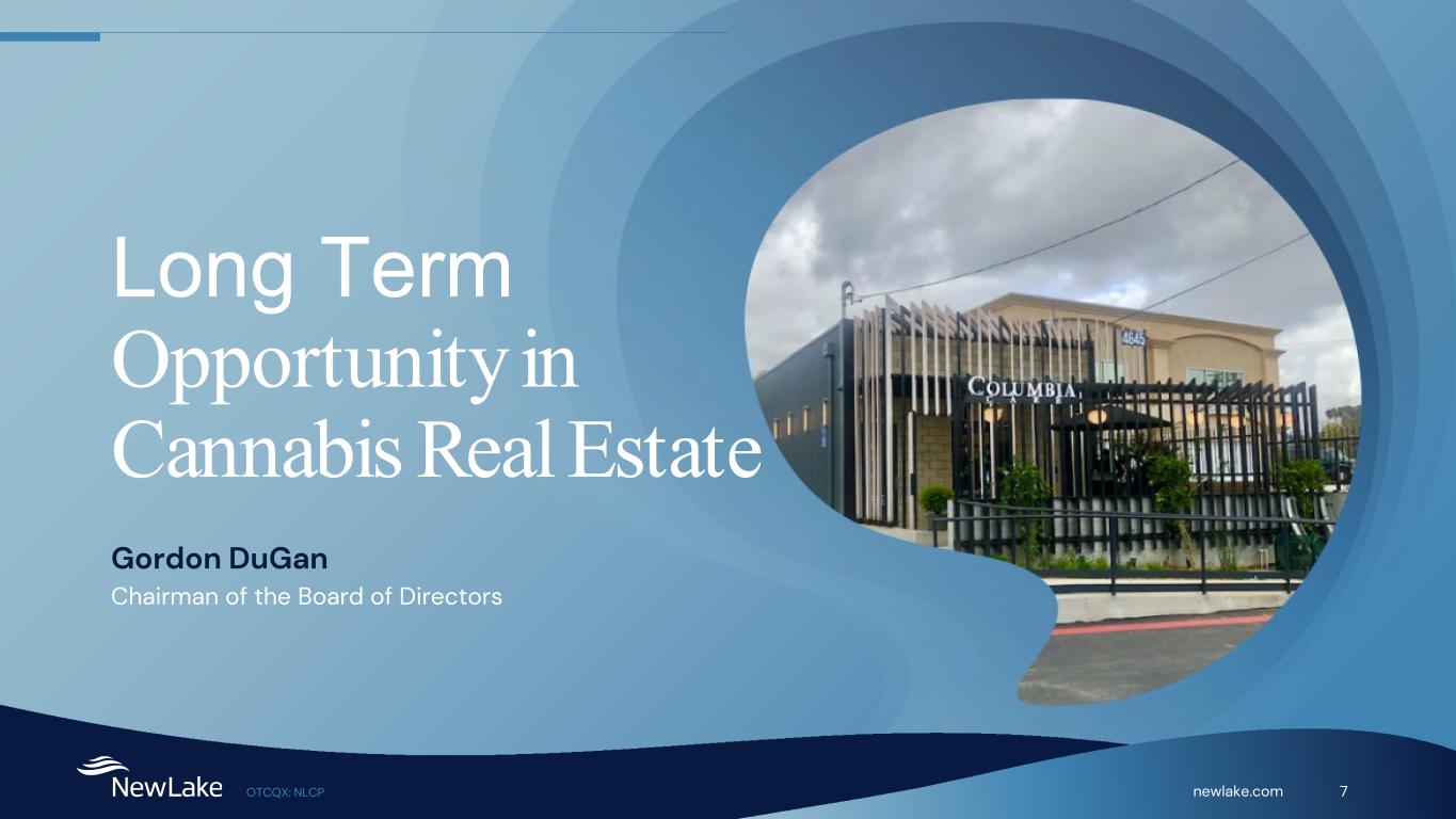 newlake.com 7OTCQX: NLCP Long Term Opportunity in Cannabis Real Estate Gordon DuGan Chairman of the Board of Directors