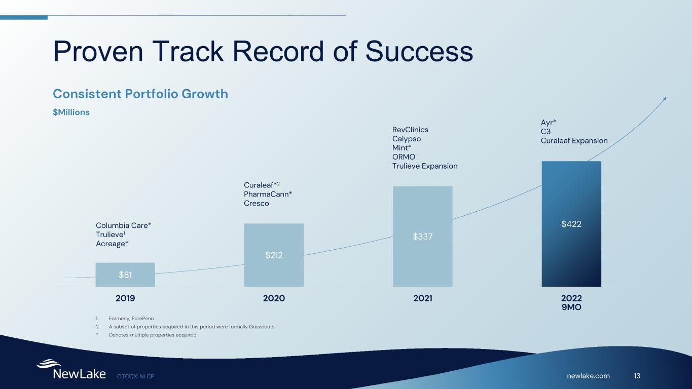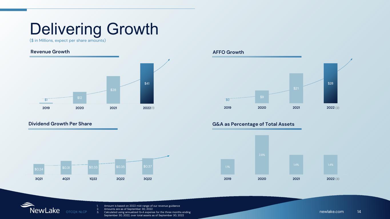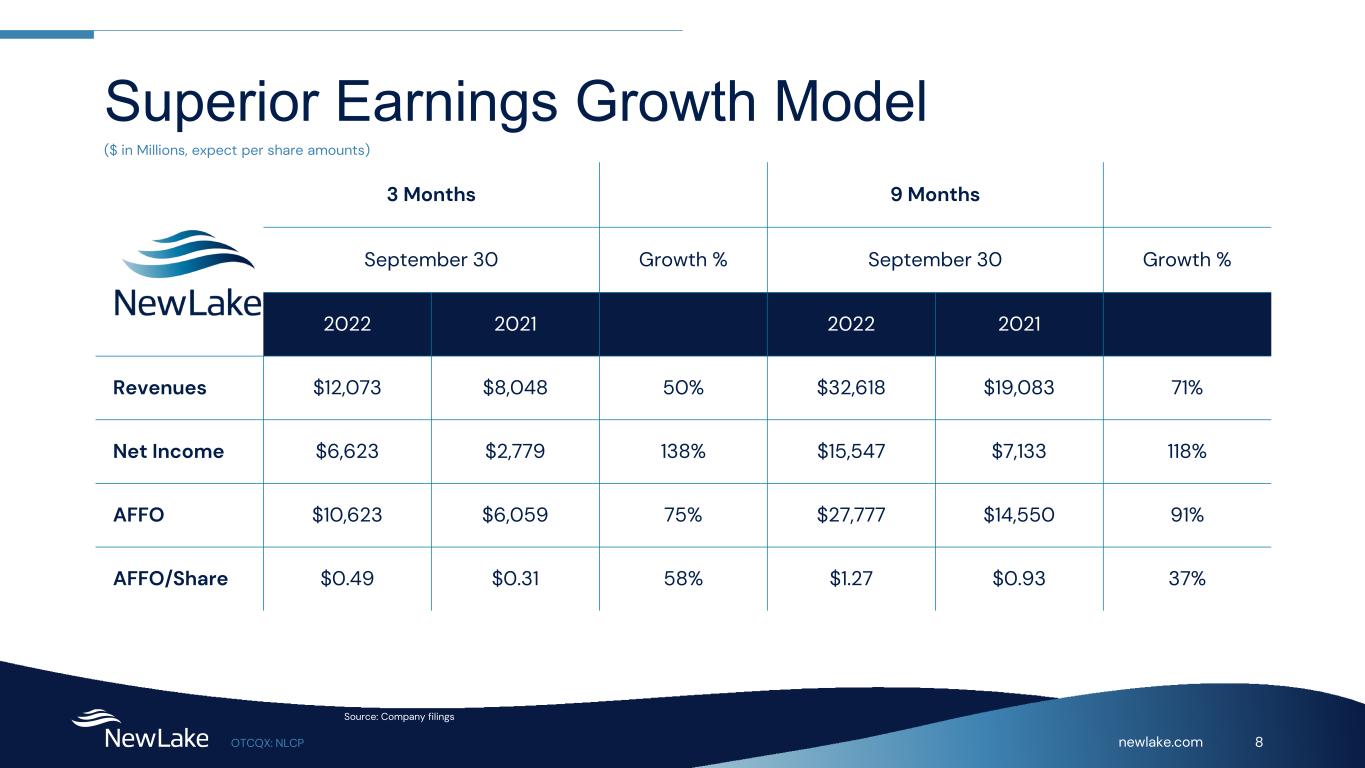 newlake.com 8OTCQX: NLCP Superior Earnings Growth Model 3 Months 9 Months September 30 Growth % September 30 Growth % 2022 2021 2022 2021 Revenues $12,073 $8,048 50% $32,618 $19,083 71% Net Income $6,623 $2,779 138% $15,547 $7,133 118% AFFO $10,623 $6,059 75% $27,777 $14,550 91% AFFO/Share $0.49 $0.31 58% $1.27 $0.93 37% ($ in Millions, expect per share amounts) Source: Company filings