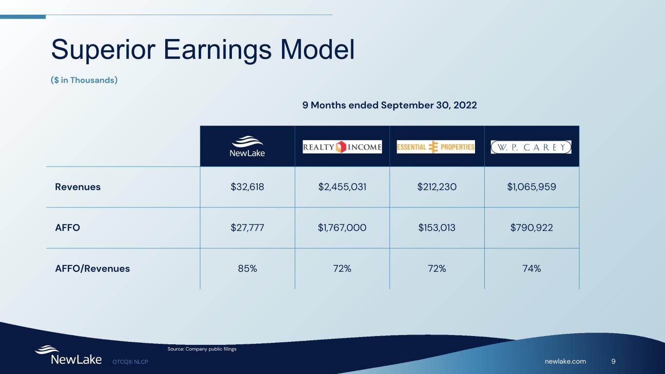 newlake.com 9OTCQX: NLCP Superior Earnings Model 9 Months ended September 30, 2022 Revenues $32,618 $2,455,031 $212,230 $1,065,959 AFFO $27,777 $1,767,000 $153,013 $790,922 AFFO/Revenues 85% 72% 72% 74% ($ in Thousands) Source: Company public filings