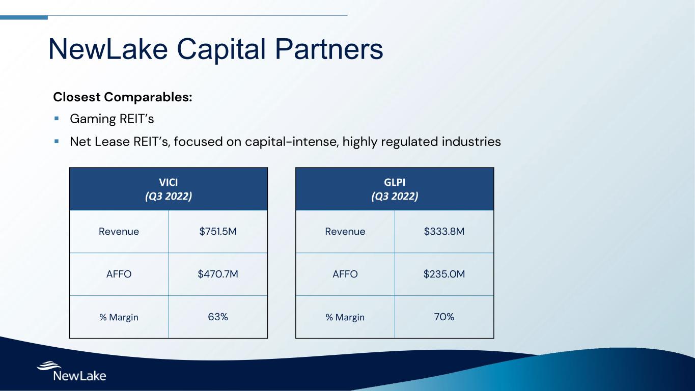 NewLake Capital Partners Gaming REIT’s Net Lease REIT’s, focused on capital-intense, highly regulated industries Closest Comparables: VICI (Q3 2022) Revenue $751.5M AFFO $470.7M % Margin 63% GLPI (Q3 2022) Revenue $333.8M AFFO $235.0M % Margin 70%