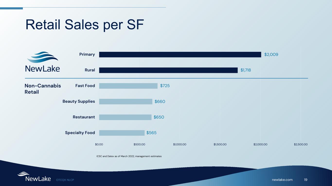 newlake.com 18OTCQX: NLCP Primary Rural Key EBITDAR Coverage 9.4x 10.4x Rent as a % of Revenue 2.8% 2.7% Average Revenue PSF $2,009 $1,718 NewLake Geographic Footprint - Retail Properties