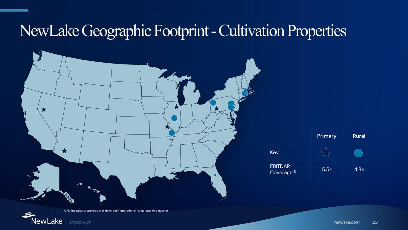newlake.com 20OTCQX: NLCP Primary Rural Key EBITDAR Coverage(1) 5.5x 4.8x 1. Only includes properties that have been operational for at least one quarter NewLake Geographic Footprint - Cultivation Properties