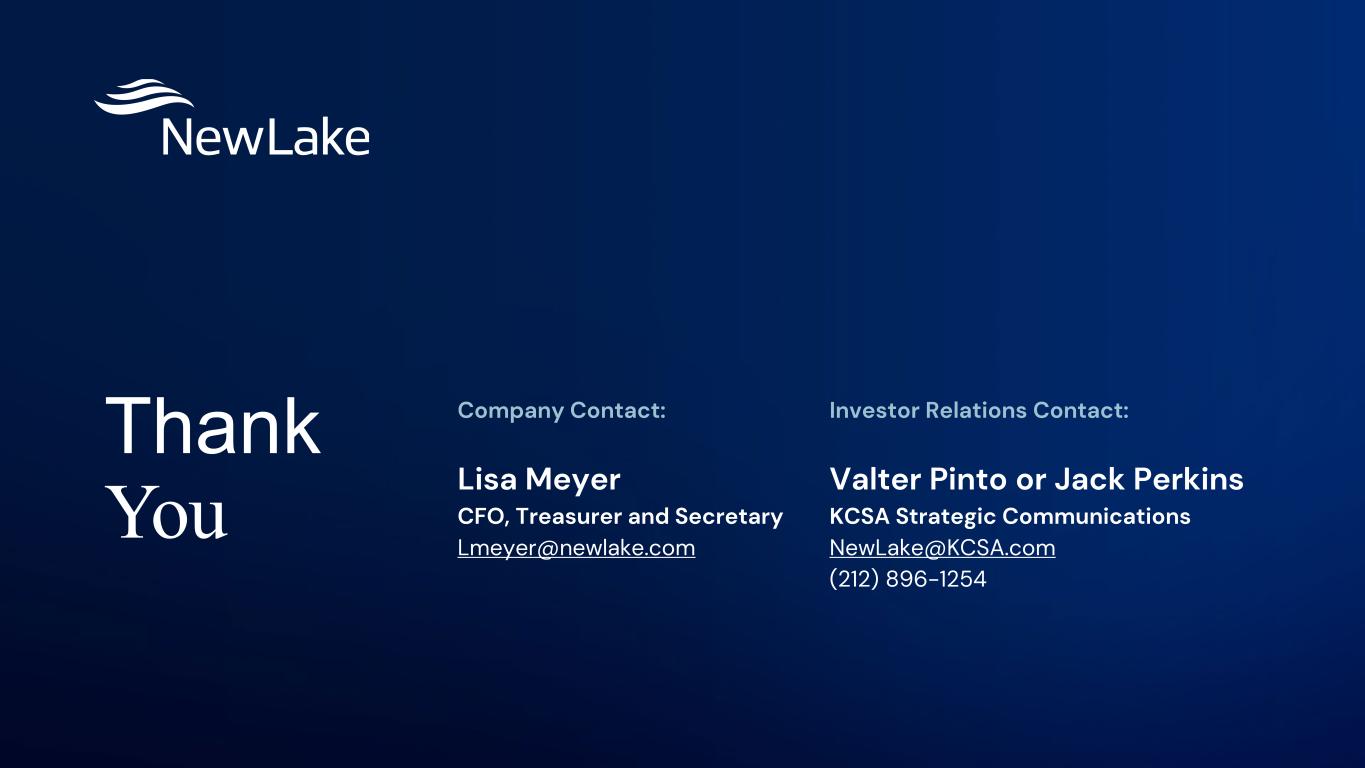 Thank You Investor Relations Contact: Valter Pinto or Jack Perkins KCSA Strategic Communications NewLake@KCSA.com (212) 896-1254 Company Contact: Lisa Meyer CFO, Treasurer and Secretary Lmeyer@newlake.com