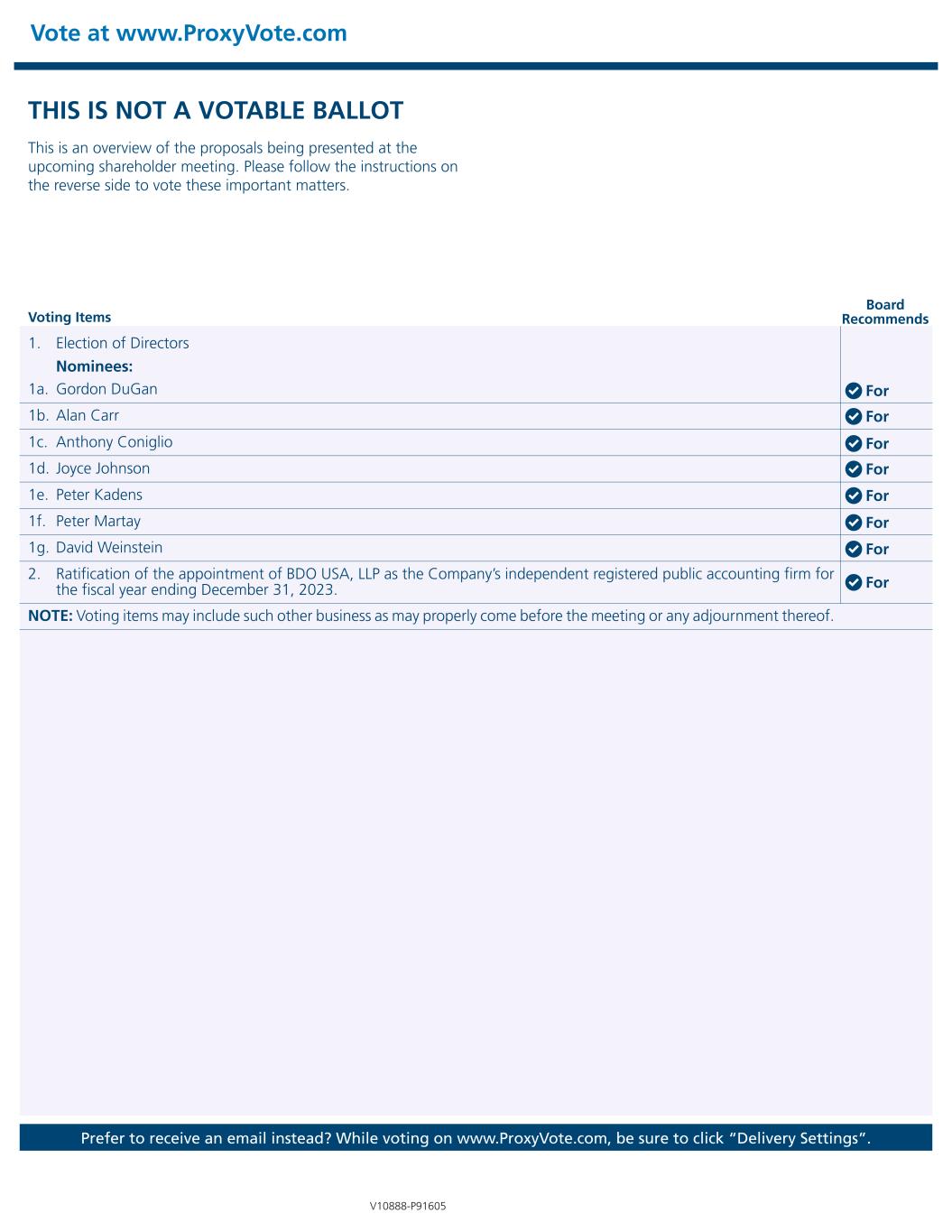 THIS IS NOT A VOTABLE BALLOT This is an overview of the proposals being presented at the upcoming shareholder meeting. Please follow the instructions on the reverse side to vote these important matters. Vote at www.ProxyVote.com Voting Items Board Recommends V10888-P91605 Prefer to receive an email instead? While voting on www.ProxyVote.com, be sure to click “Delivery Settings”. 1. Election of Directors Nominees: 1c. Anthony Coniglio 1a. Gordon DuGan 1d. Joyce Johnson 1b. Alan Carr 1e. Peter Kadens 1f. Peter Martay 1g. David Weinstein 2. Ratification of the appointment of BDO USA, LLP as the Company’s independent registered public accounting firm for the fiscal year ending December 31, 2023. NOTE: Voting items may include such other business as may properly come before the meeting or any adjournment thereof. For For For For For For For For