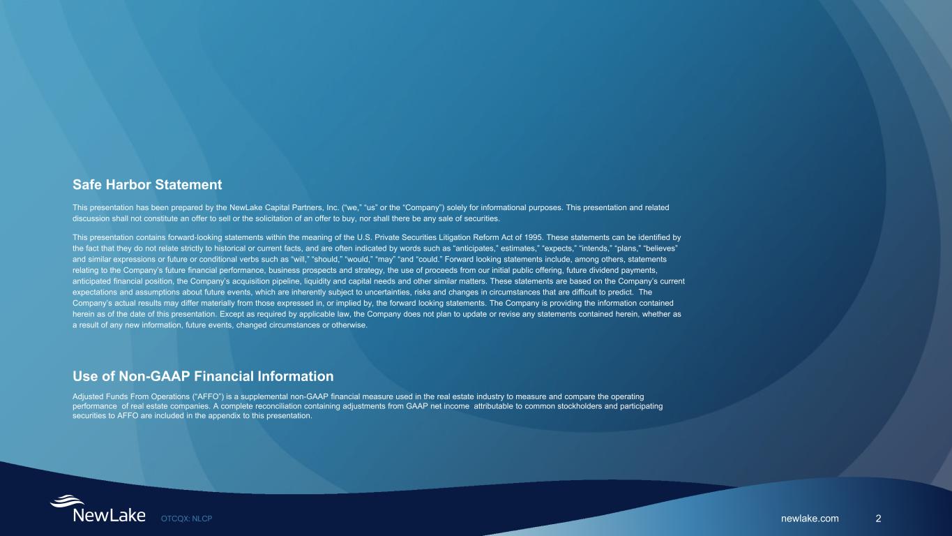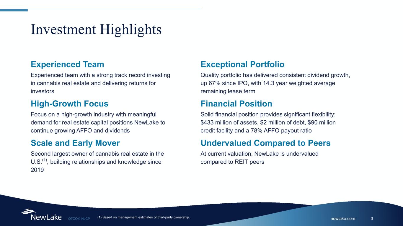 newlake.comOTCQX: NLCP 2 This presentation has been prepared by the NewLake Capital Partners, Inc. (“we,” “us” or the “Company”) solely for informational purposes. This presentation and related discussion shall not constitute an offer to sell or the solicitation of an offer to buy, nor shall there be any sale of securities. This presentation contains forward‐looking statements within the meaning of the U.S. Private Securities Litigation Reform Act of 1995. These statements can be identified by the fact that they do not relate strictly to historical or current facts, and are often indicated by words such as “anticipates,” estimates,” “expects,” “intends,” “plans,” “believes” and similar expressions or future or conditional verbs such as “will,” “should,” “would,” “may” “and “could.” Forward looking statements include, among others, statements relating to the Company’s future financial performance, business prospects and strategy, the use of proceeds from our initial public offering, future dividend payments, anticipated financial position, the Company’s acquisition pipeline, liquidity and capital needs and other similar matters. These statements are based on the Company’s current expectations and assumptions about future events, which are inherently subject to uncertainties, risks and changes in circumstances that are difficult to predict. The Company’s actual results may differ materially from those expressed in, or implied by, the forward looking statements. The Company is providing the information contained herein as of the date of this presentation. Except as required by applicable law, the Company does not plan to update or revise any statements contained herein, whether as a result of any new information, future events, changed circumstances or otherwise. Safe Harbor Statement Use of Non-GAAP Financial Information Adjusted Funds From Operations (“AFFO”) is a supplemental non-GAAP financial measure used in the real estate industry to measure and compare the operating performance of real estate companies. A complete reconciliation containing adjustments from GAAP net income attributable to common stockholders and participating securities to AFFO are included in the appendix to this presentation.
