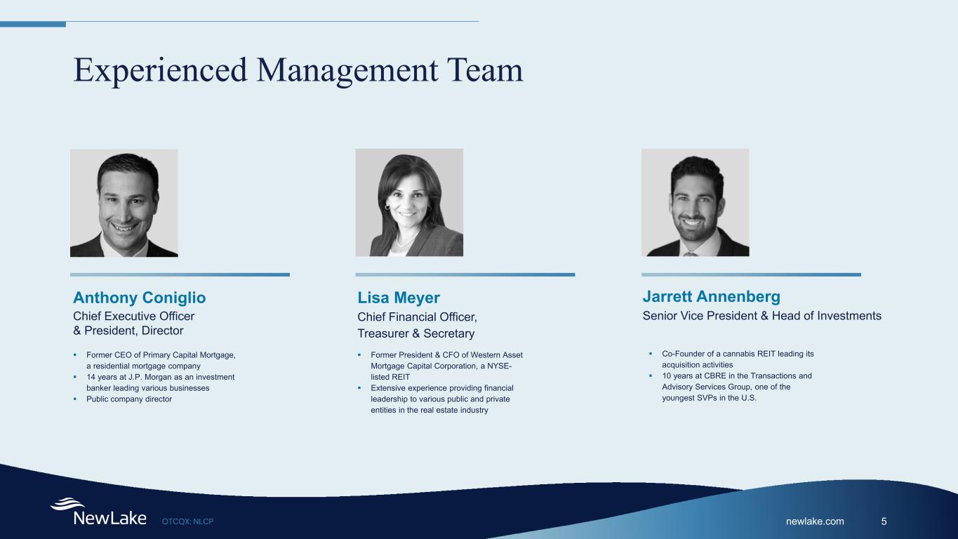 newlake.comOTCQX: NLCP 4 By The Numbers 100% Leased — All Triple-Net Leases Founded in 2019 — 2021 IPO ~$428 Million Deployed — Invested & Committed 78% AFFO Payout Ratio — Strong Dividend Coverage 31 Properties — 12 States, 1.6 Million Square Feet >0.1x Debt to EBITDA — $89 Million Available Credit Facility 11.6% Wtd. Avg. Yield — 2.7% Annual Rent Escalations Note: (1) Data as of December 31, 2023 1.3% Annualized G&A Ratio — Low General and Administrative Expenses 14.3 Years Remaining Lease Term — Weighted Average 67% Dividend Growth Since IPO — Q4 2023 vs. Q3 2021