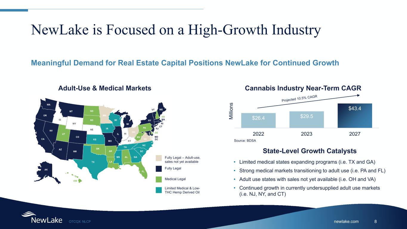 newlake.comOTCQX: NLCP 7 Experienced Board of Directors Continued Peter Kadens Independent Director Peter Martay Independent Director David Weinstein Director Co-Founder and former CEO of Green Thumb Industries, Inc., one of the leading public cannabis companies Co-Founder and former CEO of SoCore Energy, one of the largest commercial solar companies in the U.S. Former Director of KushCo Holdings, Inc. (OTCQX: KSHB) and Choice Consolidation Corp., a SPAC targeting cannabis businesses CEO of Pangea Properties, a private apartment REIT that owned more than 13,000 apartments and completed over $300 million in short term bridge loans on numerous property types across the U.S. Former banker at Bernstein Global Wealth Management, Glencoe Capital and Deutsche Bank CEO of NewLake from August 2020 – July 2022, Director Since 2019 Former CEO of MPG Office Trust, a NYSE-listed office REIT 10 years at Goldman Sachs as a real estate investment banker and investor 10 years at Belvedere Capital, a real estate investment firm