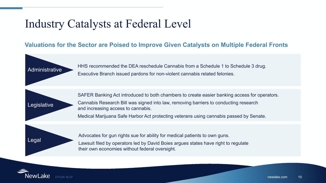newlake.comOTCQX: NLCP 10 Industry Catalysts at Federal Level Legislative SAFER Banking Act introduced to both chambers to create easier banking access for operators. Cannabis Research Bill was signed into law, removing barriers to conducting research and increasing access to cannabis. Medical Marijuana Safe Harbor Act protecting veterans using cannabis passed by Senate. Administrative HHS recommended the DEA reschedule Cannabis from a Schedule 1 to Schedule 3 drug. Executive Branch issued pardons for non-violent cannabis related felonies. Legal Advocates for gun rights sue for ability for medical patients to own guns. Lawsuit filed by operators led by David Boies argues states have right to regulate their own economies without federal oversight. Valuations for the Sector are Poised to Improve Given Catalysts on Multiple Federal Fronts