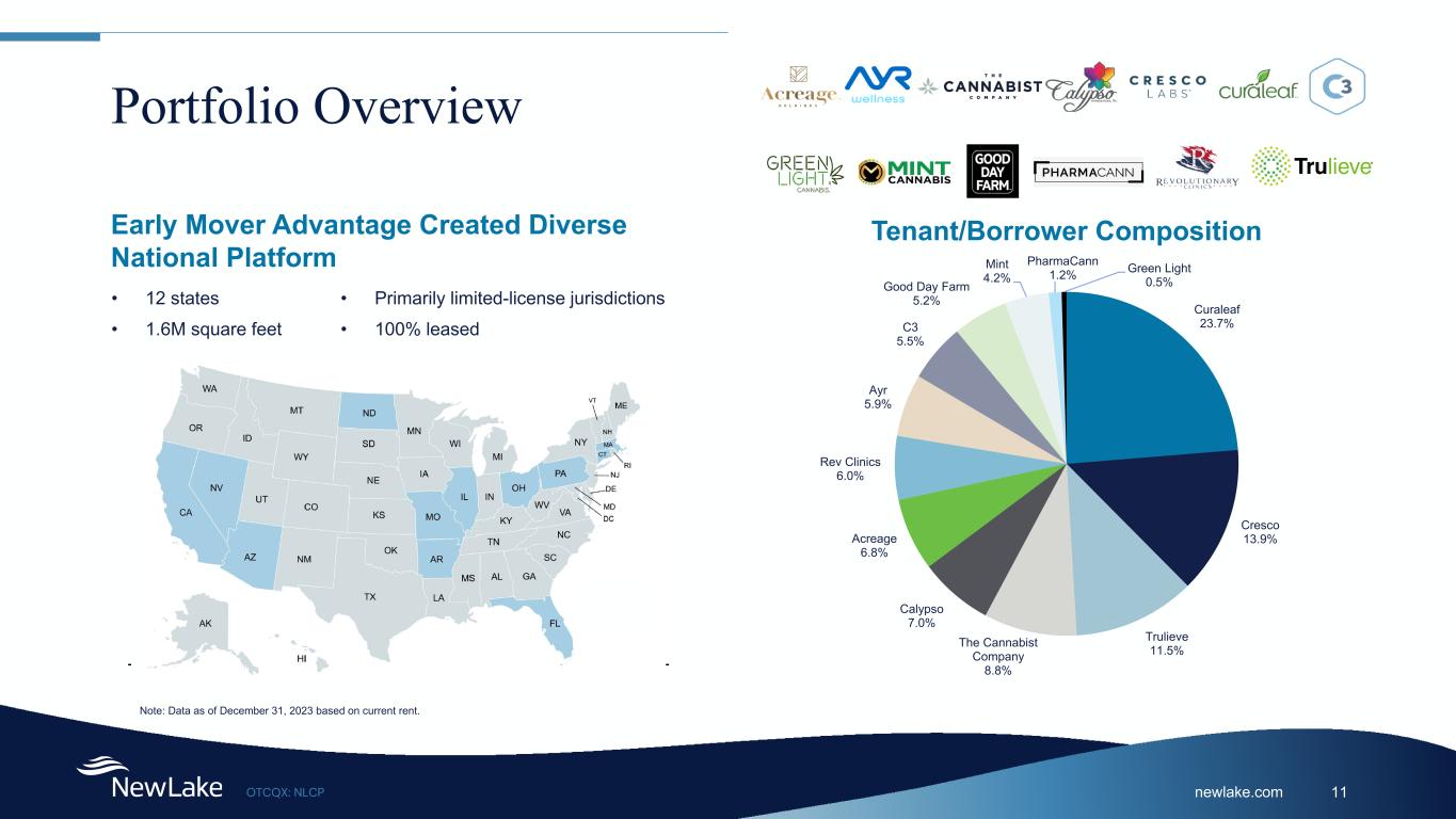 newlake.comOTCQX: NLCP 11 Portfolio Overview Early Mover Advantage Created Diverse National Platform • 12 states • 1.6M square feet • Primarily limited-license jurisdictions • 100% leased Note: Data as of December 31, 2023 based on current rent. Curaleaf 23.7% Cresco 13.9% Trulieve 11.5%The Cannabist Company 8.8% Calypso 7.0% Acreage 6.8% Rev Clinics 6.0% Ayr 5.9% C3 5.5% Good Day Farm 5.2% Mint 4.2% PharmaCann 1.2% Green Light 0.5% Tenant/Borrower Composition