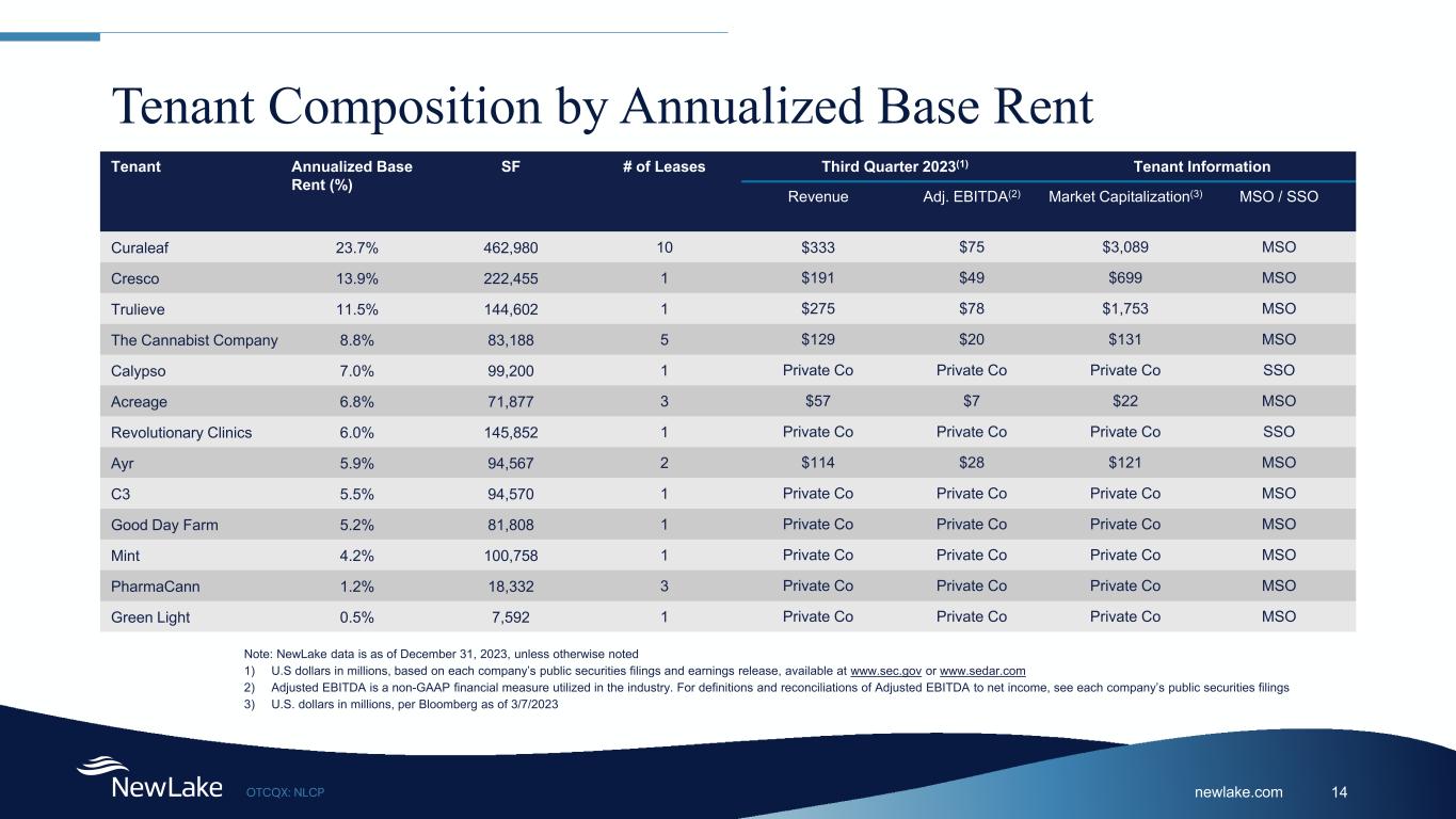 newlake.comOTCQX: NLCP 14 Tenant Composition by Annualized Base Rent Tenant Annualized Base Rent (%) SF # of Leases Third Quarter 2023(1) Tenant Information Revenue Adj. EBITDA(2) Market Capitalization(3) MSO / SSO Curaleaf 23.7% 462,980 10 $333 $75 $3,089 MSO Cresco 13.9% 222,455 1 $191 $49 $699 MSO Trulieve 11.5% 144,602 1 $275 $78 $1,753 MSO The Cannabist Company 8.8% 83,188 5 $129 $20 $131 MSO Calypso 7.0% 99,200 1 Private Co Private Co Private Co SSO Acreage 6.8% 71,877 3 $57 $7 $22 MSO Revolutionary Clinics 6.0% 145,852 1 Private Co Private Co Private Co SSO Ayr 5.9% 94,567 2 $114 $28 $121 MSO C3 5.5% 94,570 1 Private Co Private Co Private Co MSO Good Day Farm 5.2% 81,808 1 Private Co Private Co Private Co MSO Mint 4.2% 100,758 1 Private Co Private Co Private Co MSO PharmaCann 1.2% 18,332 3 Private Co Private Co Private Co MSO Green Light 0.5% 7,592 1 Private Co Private Co Private Co MSO Note: NewLake data is as of December 31, 2023, unless otherwise noted 1) U.S dollars in millions, based on each company’s public securities filings and earnings release, available at www.sec.gov or www.sedar.com 2) Adjusted EBITDA is a non-GAAP financial measure utilized in the industry. For definitions and reconciliations of Adjusted EBITDA to net income, see each company’s public securities filings 3) U.S. dollars in millions, per Bloomberg as of 3/7/2023
