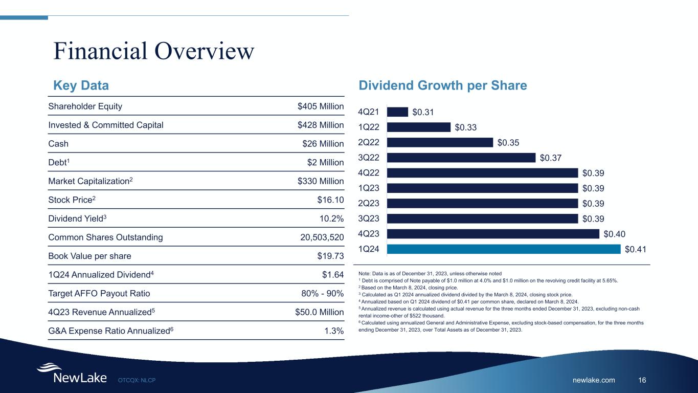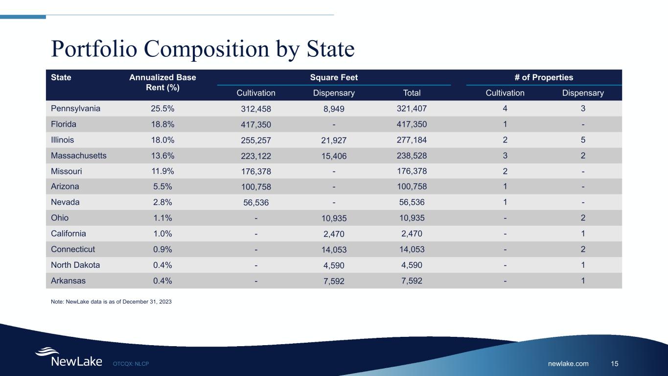 newlake.comOTCQX: NLCP 15 Portfolio Composition by State State Annualized Base Rent (%) Square Feet # of Properties Cultivation Dispensary Total Cultivation Dispensary Pennsylvania 25.5% 312,458 8,949 321,407 4 3 Florida 18.8% 417,350 - 417,350 1 - Illinois 18.0% 255,257 21,927 277,184 2 5 Massachusetts 13.6% 223,122 15,406 238,528 3 2 Missouri 11.9% 176,378 - 176,378 2 - Arizona 5.5% 100,758 - 100,758 1 - Nevada 2.8% 56,536 - 56,536 1 - Ohio 1.1% - 10,935 10,935 - 2 California 1.0% - 2,470 2,470 - 1 Connecticut 0.9% - 14,053 14,053 - 2 North Dakota 0.4% - 4,590 4,590 - 1 Arkansas 0.4% - 7,592 7,592 - 1 Note: NewLake data is as of December 31, 2023