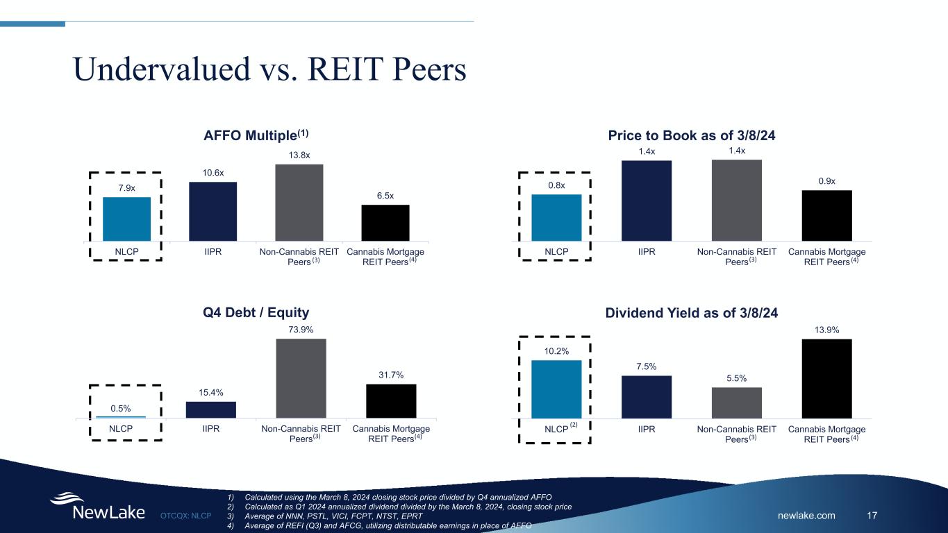 newlake.comOTCQX: NLCP 16 Financial Overview Shareholder Equity $405 Million Invested & Committed Capital $428 Million Cash $26 Million Debt1 $2 Million Market Capitalization2 $330 Million Stock Price2 $16.10 Dividend Yield3 10.2% Common Shares Outstanding 20,503,520 Book Value per share $19.73 1Q24 Annualized Dividend4 $1.64 Target AFFO Payout Ratio 80% - 90% 4Q23 Revenue Annualized5 $50.0 Million G&A Expense Ratio Annualized6 1.3% Key Data Dividend Growth per Share Note: Data is as of December 31, 2023, unless otherwise noted 1 Debt is comprised of Note payable of $1.0 million at 4.0% and $1.0 million on the revolving credit facility at 5.65%. 2 Based on the March 8, 2024, closing price. 3 Calculated as Q1 2024 annualized dividend divided by the March 8, 2024, closing stock price. 4 Annualized based on Q1 2024 dividend of $0.41 per common share, declared on March 8, 2024. 5 Annualized revenue is calculated using actual revenue for the three months ended December 31, 2023, excluding non-cash rental income-other of $522 thousand. 6 Calculated using annualized General and Administrative Expense, excluding stock-based compensation, for the three months ending December 31, 2023, over Total Assets as of December 31, 2023. $0.41 $0.40 $0.39 $0.39 $0.39 $0.39 $0.37 $0.35 $0.33 $0.31 1Q24 4Q23 3Q23 2Q23 1Q23 4Q22 3Q22 2Q22 1Q22 4Q21