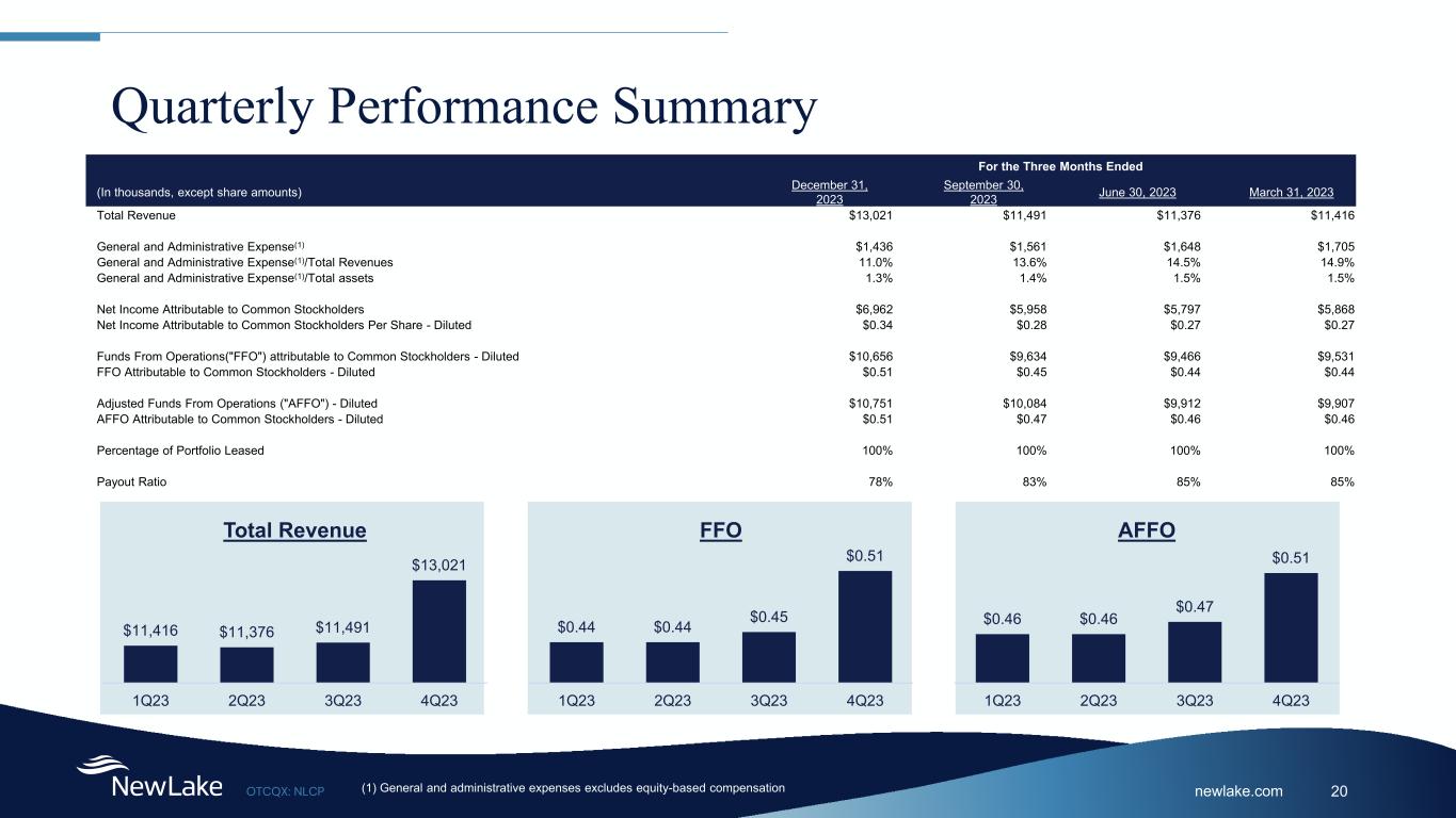 newlake.comOTCQX: NLCP 20 Quarterly Performance Summary For the Three Months Ended (In thousands, except share amounts) December 31, 2023 September 30, 2023 June 30, 2023 March 31, 2023 Total Revenue $13,021 $11,491 $11,376 $11,416 General and Administrative Expense(1) $1,436 $1,561 $1,648 $1,705 General and Administrative Expense(1)/Total Revenues 11.0% 13.6% 14.5% 14.9% General and Administrative Expense(1)/Total assets 1.3% 1.4% 1.5% 1.5% Net Income Attributable to Common Stockholders $6,962 $5,958 $5,797 $5,868 Net Income Attributable to Common Stockholders Per Share - Diluted $0.34 $0.28 $0.27 $0.27 Funds From Operations("FFO") attributable to Common Stockholders - Diluted $10,656 $9,634 $9,466 $9,531 FFO Attributable to Common Stockholders - Diluted $0.51 $0.45 $0.44 $0.44 Adjusted Funds From Operations ("AFFO") - Diluted $10,751 $10,084 $9,912 $9,907 AFFO Attributable to Common Stockholders - Diluted $0.51 $0.47 $0.46 $0.46 Percentage of Portfolio Leased 100% 100% 100% 100% Payout Ratio 78% 83% 85% 85% (1) General and administrative expenses excludes equity-based compensation $11,416 $11,376 $11,491 $13,021 1Q23 2Q23 3Q23 4Q23 Total Revenue $0.44 $0.44 $0.45 $0.51 1Q23 2Q23 3Q23 4Q23 FFO $0.46 $0.46 $0.47 $0.51 1Q23 2Q23 3Q23 4Q23 AFFO