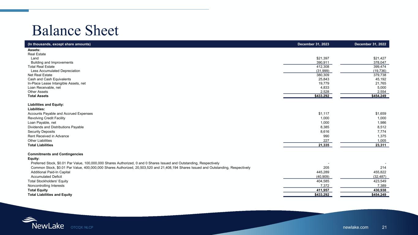 newlake.comOTCQX: NLCP 21 Balance Sheet (In thousands, except share amounts) December 31, 2023 December 31, 2022 Assets: Real Estate Land $21,397 $21,427 Building and Improvements 390,911 378,047 Total Real Estate 412,308 399,474 Less Accumulated Depreciation (31,999) (19,736) Net Real Estate 380,309 379,738 Cash and Cash Equivalents 25,843 45,192 In-Place Lease Intangible Assets, net 19,779 21,765 Loan Receivable, net 4,833 5,000 Other Assets 2,528 2,554 Total Assets $433,292 $454,249 Liabilities and Equity: Liabilities: Accounts Payable and Accrued Expenses $1,117 $1,659 Revolving Credit Facility 1,000 1,000 Loan Payable, net 1,000 1,986 Dividends and Distributions Payable 8,385 8,512 Security Deposits 8,616 7,774 Rent Received in Advance 990 1,375 Other Liabilities 227 1,005 Total Liabilities 21,335 23,311 Commitments and Contingencies Equity: Preferred Stock, $0.01 Par Value, 100,000,000 Shares Authorized, 0 and 0 Shares Issued and Outstanding, Respectively - - Common Stock, $0.01 Par Value, 400,000,000 Shares Authorized, 20,503,520 and 21,408,194 Shares Issued and Outstanding, Respectively 205 214 Additional Paid-In Capital 445,289 455,822 Accumulated Deficit (40,909) (32,487) Total Stockholders' Equity 404,585 423,549 Noncontrolling Interests 7,372 7,389 Total Equity 411,957 430,938 Total Liabilities and Equity $433,292 $454,249