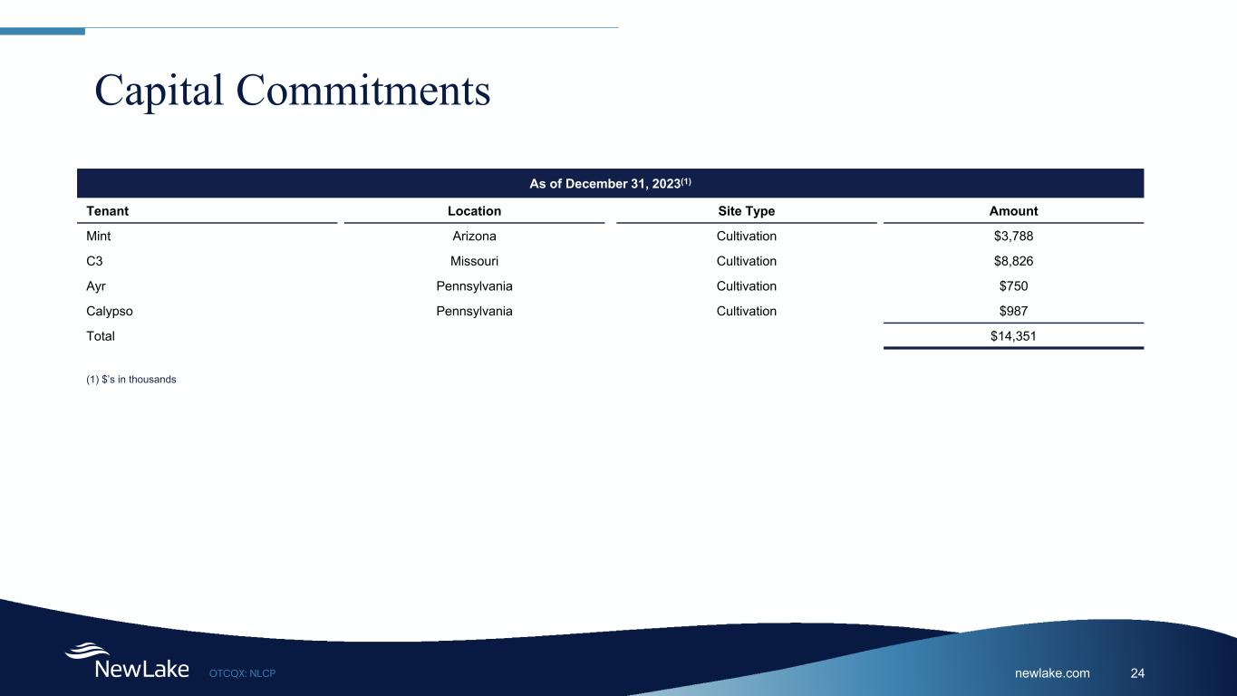 newlake.comOTCQX: NLCP 24 Capital Commitments As of December 31, 2023(1) Tenant Location Site Type Amount Mint Arizona Cultivation $3,788 C3 Missouri Cultivation $8,826 Ayr Pennsylvania Cultivation $750 Calypso Pennsylvania Cultivation $987 Total $14,351 (1) $’s in thousands