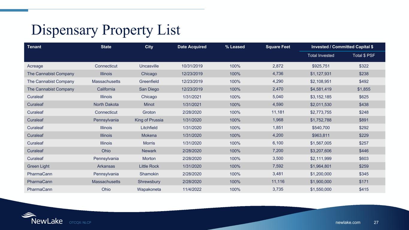 newlake.comOTCQX: NLCP 27 Dispensary Property List Tenant State City Date Acquired % Leased Square Feet Invested / Committed Capital $ Total Invested Total $ PSF Acreage Connecticut Uncasville 10/31/2019 100% 2,872 $925,751 $322 The Cannabist Company Illinois Chicago 12/23/2019 100% 4,736 $1,127,931 $238 The Cannabist Company Massachusetts Greenfield 12/23/2019 100% 4,290 $2,108,951 $492 The Cannabist Company California San Diego 12/23/2019 100% 2,470 $4,581,419 $1,855 Curaleaf Illinois Chicago 1/31/2021 100% 5,040 $3,152,185 $625 Curaleaf North Dakota Minot 1/31/2021 100% 4,590 $2,011,530 $438 Curaleaf Connecticut Groton 2/28/2020 100% 11,181 $2,773,755 $248 Curaleaf Pennsylvania King of Prussia 1/31/2020 100% 1,968 $1,752,788 $891 Curaleaf Illinois Litchfield 1/31/2020 100% 1,851 $540,700 $292 Curaleaf Illinois Mokena 1/31/2020 100% 4,200 $963,811 $229 Curaleaf Illinois Morris 1/31/2020 100% 6,100 $1,567,005 $257 Curaleaf Ohio Newark 2/28/2020 100% 7,200 $3,207,606 $446 Curaleaf Pennsylvania Morton 2/28/2020 100% 3,500 $2,111,999 $603 Green Light Arkansas Little Rock 1/31/2020 100% 7,592 $1,964,801 $259 PharmaCann Pennsylvania Shamokin 2/28/2020 100% 3,481 $1,200,000 $345 PharmaCann Massachusetts Shrewsbury 2/28/2020 100% 11,116 $1,900,000 $171 PharmaCann Ohio Wapakoneta 11/4/2022 100% 3,735 $1,550,000 $415