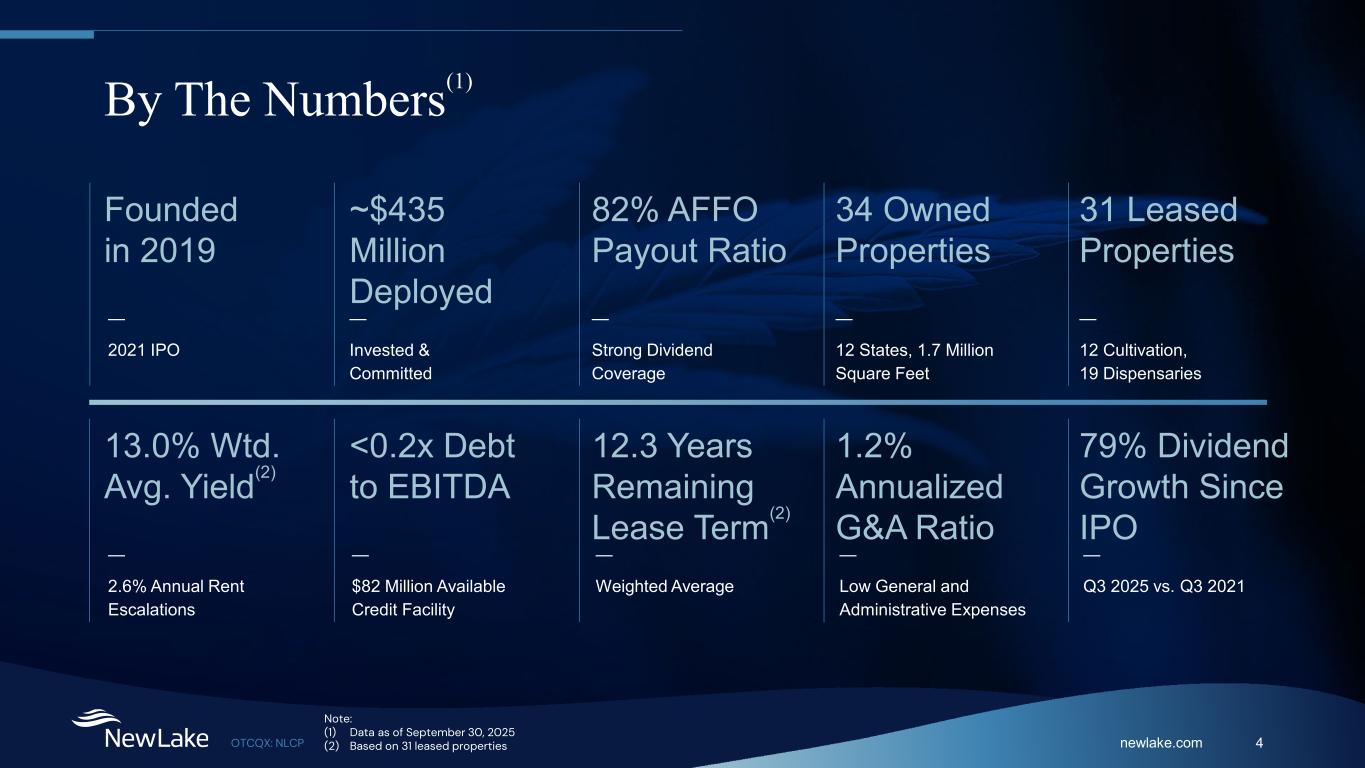 newlake.comOTCQX: NLCP 3 Investment Highlights Experienced Team Experienced team with a strong track record investing in cannabis real estate and delivering returns for investors Growth-Oriented Focus Cannabis is positioned for sustained long-term growth and requires significant real estate capital for expansion. Scale and Early Mover Second largest owner of cannabis real estate in the U.S.(1), building relationships and knowledge since 2019 Quality Portfolio Quality portfolio has delivered dividend growth, up 79% since IPO, with 12.3 year weighted average remaining lease term Financial Position Solid financial position provides significant flexibility: $432 million in gross real estate assets, $8 million of debt outstanding on our $90 million credit facility and an 82% AFFO payout ratio Undervalued Compared to Peers At current valuation, NewLake is undervalued compared to REIT peers (1) Based on management estimates of third-party ownership.