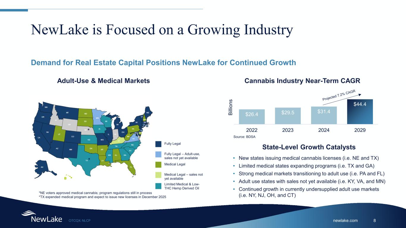 newlake.comOTCQX: NLCP 8 NewLake is Focused on a Growing Industry Demand for Real Estate Capital Positions NewLake for Continued Growth Adult-Use & Medical Markets Fully Legal – Adult-use, sales not yet available Fully Legal Medical Legal Limited Medical & Low- THC Hemp Derived Oil $26.4 $29.5 $31.4 $44.4 2022 2023 2024 2029 Bi llio ns Cannabis Industry Near-Term CAGR Source: BDSA • New states issuing medical cannabis licenses (i.e. NE and TX) • Limited medical states expanding programs (i.e. TX and GA) • Strong medical markets transitioning to adult use (i.e. PA and FL) • Adult use states with sales not yet available (i.e. KY, VA, and MN) • Continued growth in currently undersupplied adult use markets (i.e. NY, NJ, OH, and CT) State-Level Growth Catalysts Medical Legal – sales not yet available *NE voters approved medical cannabis; program regulations still in process *TX expended medical program and expect to issue new licenses in December 2025 * *
