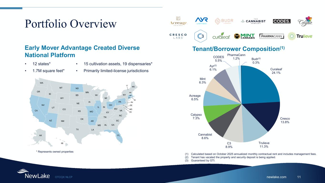 newlake.comOTCQX: NLCP 28 Dispensary Property List Tenant State City Date Acquired % Leased Square Feet Invested / Committed Capital $ In Place Under Development Total Invested Total Committed Total $ Total $ PSF Budr(1) Connecticut Uncasville 10/31/2019 100% 2,872 $925,751 $322 The Cannabist Company Illinois Chicago 12/23/2019 100% 4,736 $1,127,931 $238 The Cannabist Company Massachusetts Greenfield 12/23/2019 100% 4,290 $2,108,951 $492 The Cannabist Company California San Diego 12/23/2019 100% 2,470 $4,581,419 $1,855 Cresco Labs Ohio Proctorville 2/19/2025 100% 5,807(3) $285,000 $705,000 $990,000 $171 Cresco Labs Ohio Bridgeport 4/25/25 100% - 3,508 $500,000 $375,000 $875,000 $223 Curaleaf Illinois Chicago 1/31/2021 100% 5,040 $3,152,185 $625 Curaleaf North Dakota Minot 1/31/2021 100% 4,590 $2,011,530 $438 Curaleaf Connecticut Groton 2/28/2020 100% 11,181 $2,773,755 $248 Curaleaf Pennsylvania King of Prussia 1/31/2020 100% 1,968 $1,752,788 $891 Curaleaf Pennsylvania Brookville 6/12/2025 100% 4,167 $963,811 $231 Curaleaf Illinois Litchfield 1/31/2020 100% 1,851 $540,700 $292 Curaleaf Illinois Morris 1/31/2020 100% 6,100 $1,567,005 $257 Curaleaf Ohio Newark 2/28/2020 100% 7,200 $3,207,606 $446 Curaleaf Pennsylvania Morton 2/28/2020 100% 3,500 $2,111,999 $603 CODES(2) Arkansas Little Rock 1/31/2020 100% 7,592 $1,964,801 $259 PharmaCann Pennsylvania Shamokin 2/28/2020 100% 3,481 $1,200,000 $345 PharmaCann Massachusetts Shrewsbury 2/28/2020 100% 11,116 $1,900,000 $171 PharmaCann Ohio Wapakoneta 11/4/2022 100% 3,735 $1,550,000 $415 (1) Previously owned by Acreage; new tenant guaranteed by GTI (2) Previously owned by Greenlight (3) Property became operational in Q3; TI to be dispersed in Q3
