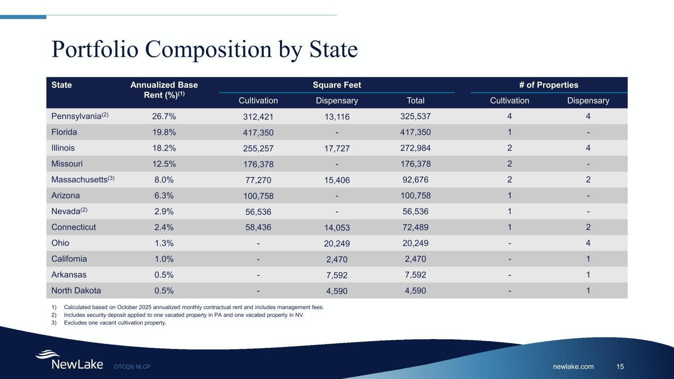 newlake.comOTCQX: NLCP 14 Tenant Composition by Annualized Base Rent Tenant Annualized Base Rent (%)(1) SF # of Leases Q2 2025(2) Tenant Information Revenue Adj. EBITDA(3) MSO / SSO Curaleaf 24.1% 462,947 10 $314 $65 MSO Cresco Labs 13.8% 232,184 3 $164 $41 MSO Trulieve 11.3% 144,602 1 $302 $111 MSO C3 Industries 8.9% 153,006 2 Private Co Private Co MSO The Cannabist Company 8.6% 83,188 5 $86 $8 MSO Calypso 7.3% 99,163 1 Private Co Private Co SSO Acreage (Canopy USA) 6.5% 69,005 2 Private Co Private Co MSO Mint 6.3% 100,758 1 Private Co Private Co MSO Ayr Wellness(4) 6.1% 94,566 2 N/A N/A MSO CODES(5) 5.5% 89,400 2 Private Co Private Co MSO PharmaCann 1.2% 18,332 3 Private Co Private Co MSO Budr(6) 0.3% 2,872 1 Private Co Private Co MSO Note: NewLake data is as of September 30, 2025, unless otherwise noted 1) Calculated based on October 2025 annualized monthly contractual rent and includes management fees. 2) U.S dollars in millions, based on each company’s public securities filings and earnings release, available at www.sec.gov or www.sedar.com. 3) Adjusted EBITDA is a non-GAAP financial measure utilized in the industry. For definitions and reconciliations of Adjusted EBITDA to net income, see each company’s public securities filings. 4) Tenant has vacated the property and security deposit is being applied. 5) Single state entities managed by an MSO; previously Organic Remedies and Greenlight. 6) Guaranteed by GTI.