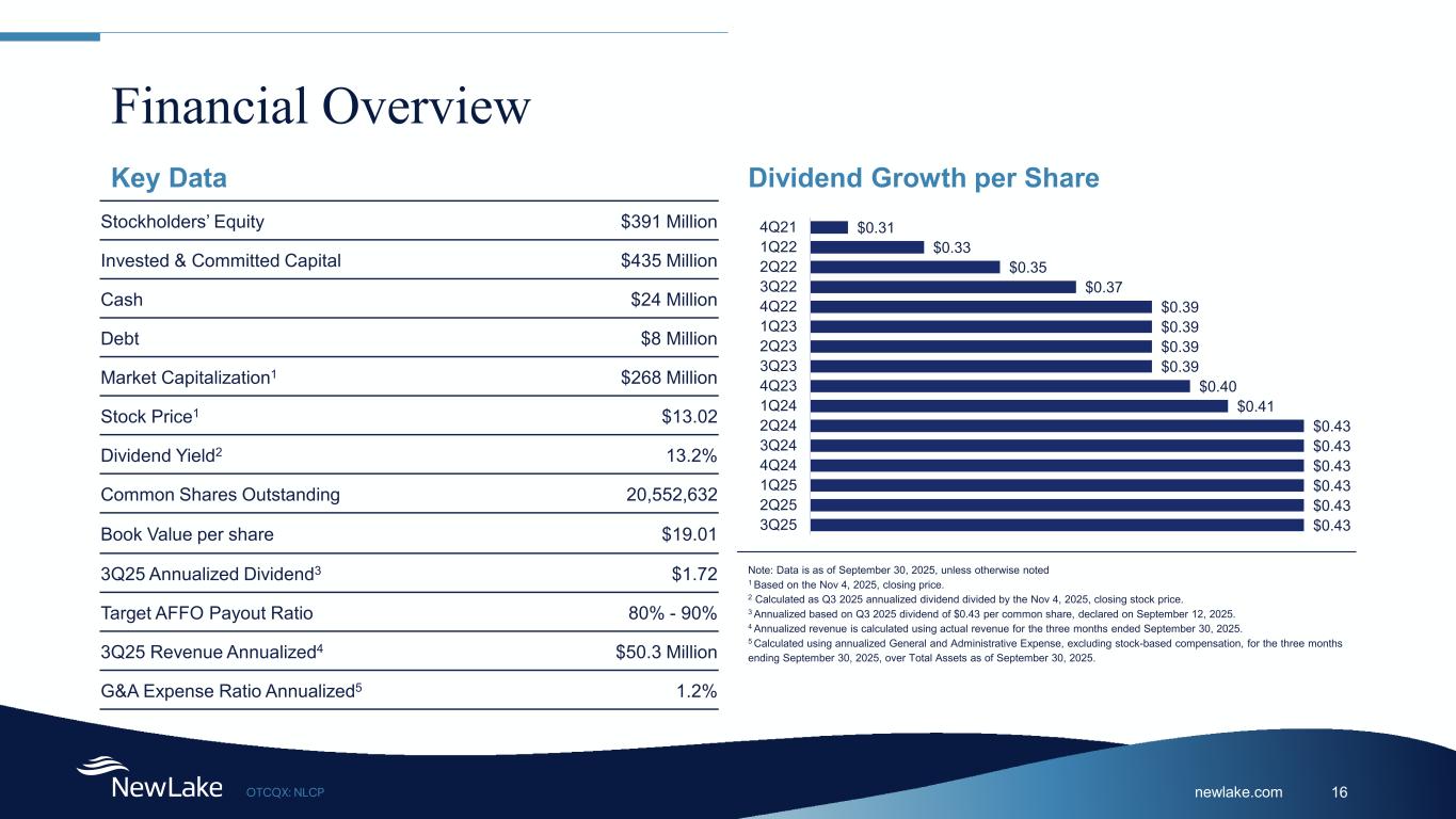 newlake.comOTCQX: NLCP 15 Portfolio Composition by State State Annualized Base Rent (%)(1) Square Feet # of Properties Cultivation Dispensary Total Cultivation Dispensary Pennsylvania(2) 26.7% 312,421 13,116 325,537 4 4 Florida 19.8% 417,350 - 417,350 1 - Illinois 18.2% 255,257 17,727 272,984 2 4 Missouri 12.5% 176,378 - 176,378 2 - Massachusetts(3) 8.0% 77,270 15,406 92,676 2 2 Arizona 6.3% 100,758 - 100,758 1 - Nevada(2) 2.9% 56,536 - 56,536 1 - Connecticut 2.4% 58,436 14,053 72,489 1 2 Ohio 1.3% - 20,249 20,249 - 4 California 1.0% - 2,470 2,470 - 1 Arkansas 0.5% - 7,592 7,592 - 1 North Dakota 0.5% - 4,590 4,590 - 1 1) Calculated based on October 2025 annualized monthly contractual rent and includes management fees. 2) Includes security deposit applied to one vacated property in PA and one vacated property in NV. 3) Excludes one vacant cultivation property.