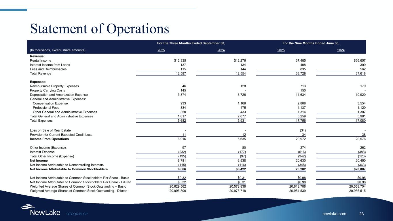 newlake.comOTCQX: NLCP 23 Statement of Operations For the Three Months Ended September 30, For the Nine Months Ended June 30, (In thousands, except share amounts) 2025 2024 2025 2024 Revenue: Rental Income $12,335 $12,276 37,485 $36,657 Interest Income from Loans 137 134 408 399 Fees and Reimbursables 115 144 835 562 Total Revenue 12,587 12,554 38,728 37,618 Expenses: Reimbursable Property Expenses 46 128 713 179 Property Carrying Costs 145 - 150 - Depreciation and Amortization Expense 3,874 3,726 11,634 10,920 General and Administrative Expenses: Compensation Expense 933 1,169 2,808 3,554 Professional Fees 334 475 1,137 1,120 Other General and Administrative Expenses 350 433 1,314 1,307 Total General and Administrative Expenses 1,617 2,077 5,259 5,981 Total Expenses 5,682 5,931 17,756 17,080 Loss on Sale of Real Estate - - (34) - Provision for Current Expected Credit Loss 11 12 34 38 Income From Operations 6,916 6,635 20,972 20,576 Other Income (Expense): 97 80 274 262 Interest Expense (232) (177) (616) (388) Total Other Income (Expense) (135) (97) (342) (126) Net Income 6,781 6,538 20,630 20,450 Net Income Attributable to Noncontrolling Interests (115) (116) (348) (363) Net Income Attributable to Common Stockholders 6,666 $6,422 20,282 $20,087 Net Income Attributable to Common Stockholders Per Share - Basic $0.32 $0.31 $0.98 $0.98 Net Income Attributable to Common Stockholders Per Share - Diluted $0.32 $0.31 $0.98 $0.98 Weighted Average Shares of Common Stock Outstanding – Basic 20,629,562 20,578,838 20,613,788 20,558,754 Weighted Average Shares of Common Stock Outstanding - Diluted 20,995,800 20,975,718 20,981,539 20,956,515