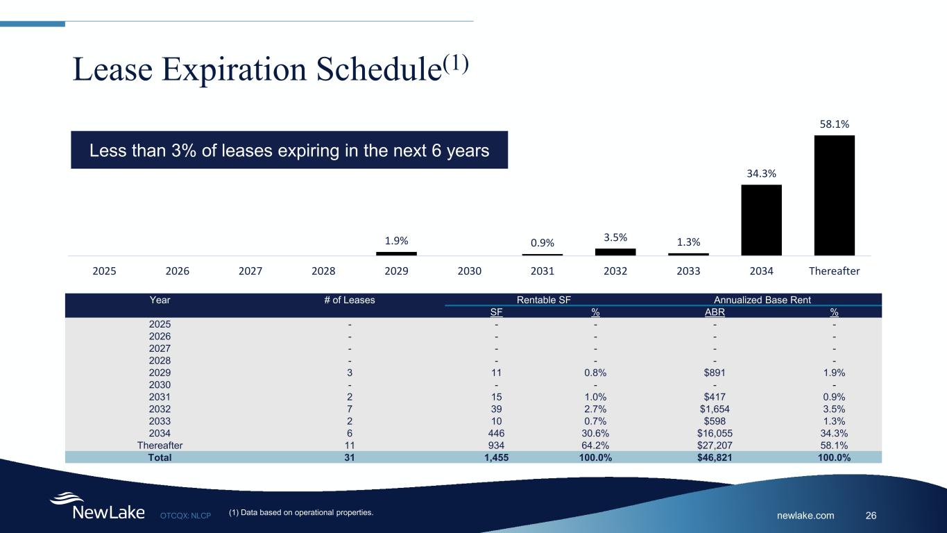 newlake.comOTCQX: NLCP 25 Capital Commitments As of June 30, 2025(1) Tenant Location Site Type Amount Cresco Labs Ohio Dispensary $375 Cresco Labs Ohio Dispensary $705 Total $1,080 (1) $’s in thousands