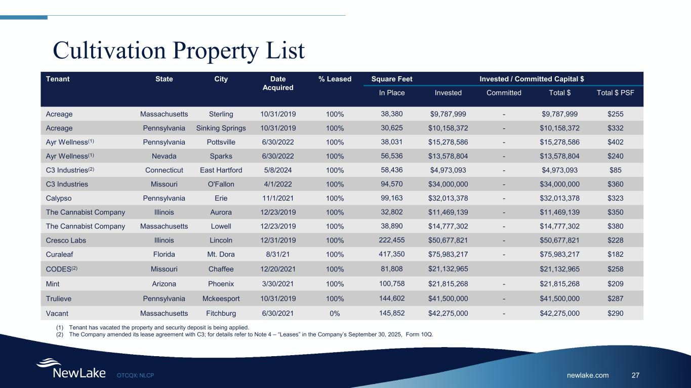 newlake.comOTCQX: NLCP 27 Cultivation Property List Tenant State City Date Acquired % Leased Square Feet Invested / Committed Capital $ In Place Invested Committed Total $ Total $ PSF Acreage Massachusetts Sterling 10/31/2019 100% 38,380 $9,787,999 - $9,787,999 $255 Acreage Pennsylvania Sinking Springs 10/31/2019 100% 30,625 $10,158,372 - $10,158,372 $332 Ayr Wellness(1) Pennsylvania Pottsville 6/30/2022 100% 38,031 $15,278,586 - $15,278,586 $402 Ayr Wellness(1) Nevada Sparks 6/30/2022 100% 56,536 $13,578,804 - $13,578,804 $240 C3 Industries(2) Connecticut East Hartford 5/8/2024 100% 58,436 $4,973,093 - $4,973,093 $85 C3 Industries Missouri O'Fallon 4/1/2022 100% 94,570 $34,000,000 - $34,000,000 $360 Calypso Pennsylvania Erie 11/1/2021 100% 99,163 $32,013,378 - $32,013,378 $323 The Cannabist Company Illinois Aurora 12/23/2019 100% 32,802 $11,469,139 - $11,469,139 $350 The Cannabist Company Massachusetts Lowell 12/23/2019 100% 38,890 $14,777,302 - $14,777,302 $380 Cresco Labs Illinois Lincoln 12/31/2019 100% 222,455 $50,677,821 - $50,677,821 $228 Curaleaf Florida Mt. Dora 8/31/21 100% 417,350 $75,983,217 - $75,983,217 $182 CODES(2) Missouri Chaffee 12/20/2021 100% 81,808 $21,132,965 $21,132,965 $258 Mint Arizona Phoenix 3/30/2021 100% 100,758 $21,815,268 - $21,815,268 $209 Trulieve Pennsylvania Mckeesport 10/31/2019 100% 144,602 $41,500,000 - $41,500,000 $287 Vacant Massachusetts Fitchburg 6/30/2021 0% 145,852 $42,275,000 - $42,275,000 $290 (1) Tenant has vacated the property and security deposit is being applied. (2) The Company amended its lease agreement with C3; for details refer to Note 4 – “Leases” in the Company’s September 30, 2025, Form 10Q.