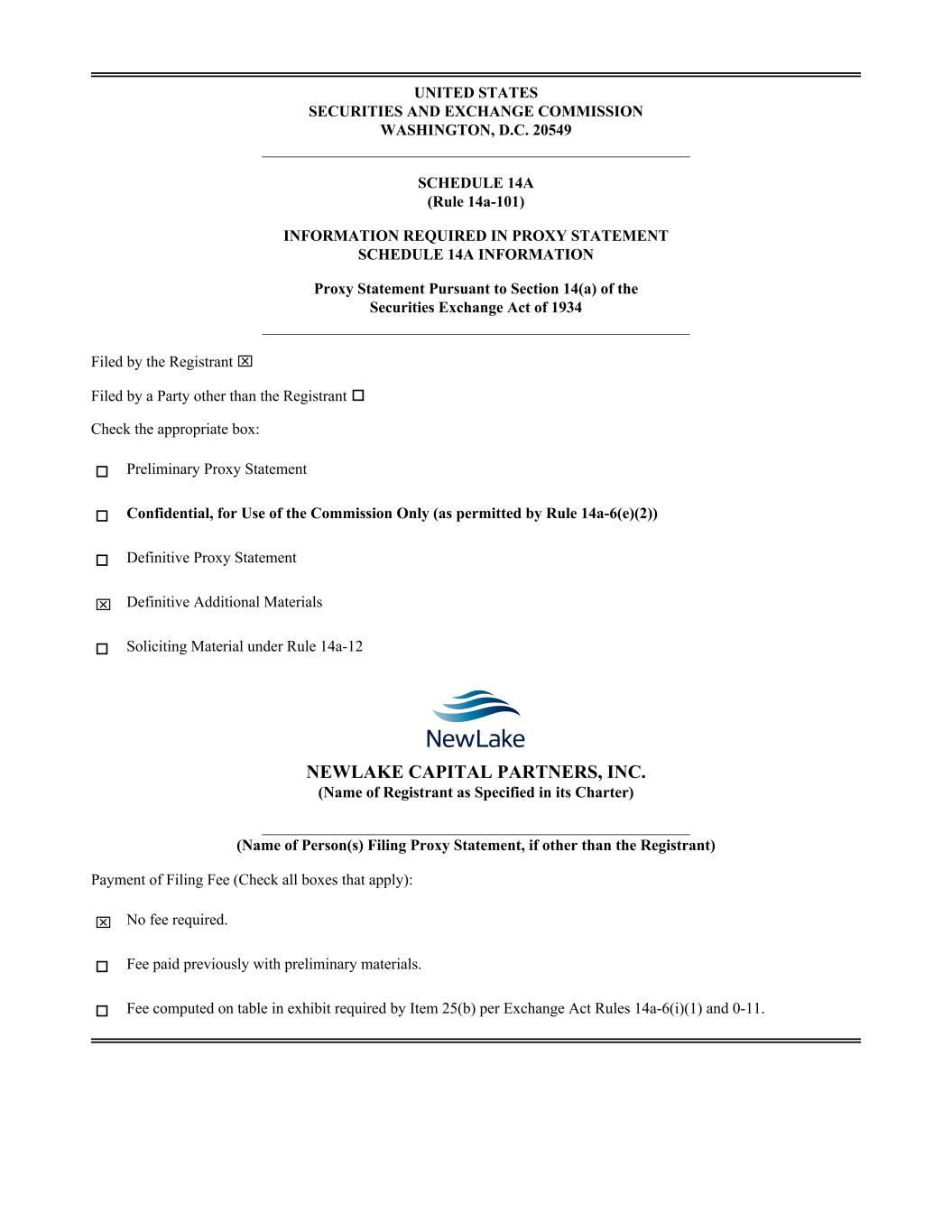 UNITED STATES SECURITIES AND EXCHANGE COMMISSION WASHINGTON, D.C. 20549 _______________________________________________________ SCHEDULE 14A (Rule 14a-101) INFORMATION REQUIRED IN PROXY STATEMENT SCHEDULE 14A INFORMATION Proxy Statement Pursuant to Section 14(a) of the Securities Exchange Act of 1934 _______________________________________________________ Filed by the Registrant x Filed by a Party other than the Registrant o Check the appropriate box: o Preliminary Proxy Statement o Confidential, for Use of the Commission Only (as permitted by Rule 14a-6(e)(2)) o Definitive Proxy Statement x Definitive Additional Materials o Soliciting Material under Rule 14a-12 NEWLAKE CAPITAL PARTNERS, INC. (Name of Registrant as Specified in its Charter) _______________________________________________________ (Name of Person(s) Filing Proxy Statement, if other than the Registrant) Payment of Filing Fee (Check all boxes that apply): x No fee required. o Fee paid previously with preliminary materials. o Fee computed on table in exhibit required by Item 25(b) per Exchange Act Rules 14a-6(i)(1) and 0-11.