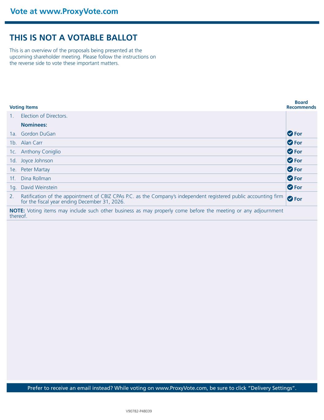Vote at www.ProxyVote.com Prefer to receive an email instead? While voting on www.ProxyVote.com, be sure to click “Delivery Settings”. Voting Items Board Recommends V90782-P48039 THIS IS NOT A VOTABLE BALLOT This is an overview of the proposals being presented at the upcoming shareholder meeting. Please follow the instructions on the reverse side to vote these important matters. 1. Election of Directors. Nominees: 1a. Gordon DuGan For 1b. Alan Carr For 1c. Anthony Coniglio For 1d. Joyce Johnson For 1e. Peter Martay For 1f. Dina Rollman For 1g. David Weinstein For 2. Ratification of the appointment of CBIZ CPAs P.C. as the Company’s independent registered public accounting firm for the fiscal year ending December 31, 2026. For NOTE: Voting items may include such other business as may properly come before the meeting or any adjournment thereof.